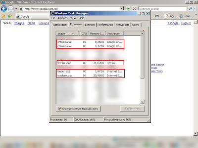 Chrome took up about 13Mb, firefox took 21Mb and IE used about 31Mb.